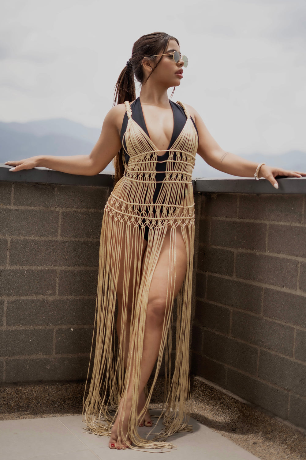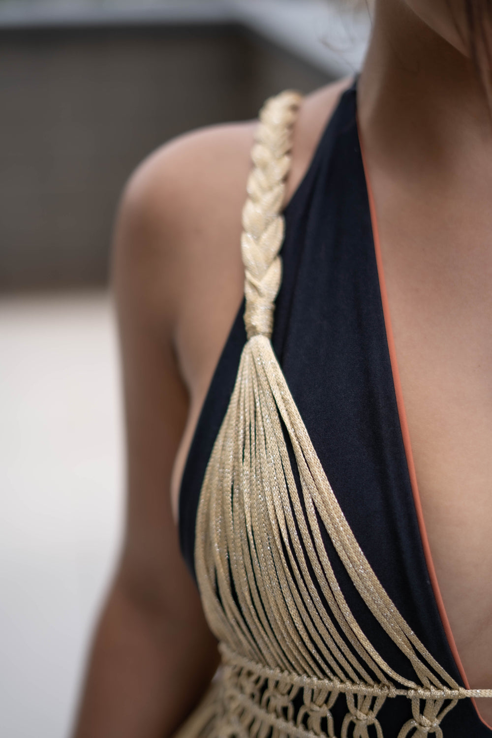 Salida de baño en Macramé, hecha a mano con hilo dorado en poliester, lleva nudos planos y festón.